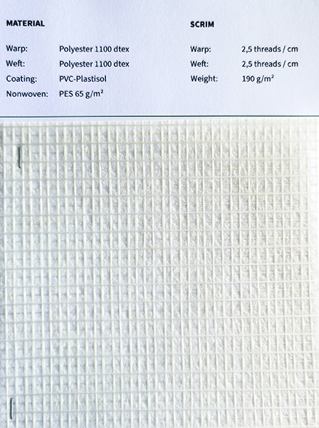 經(jīng)紗Polyester 1100 dtex 緯紗Polyester 1100 dtex 涂層PVC Plastisol 無紡布PES 65 g/m2 |